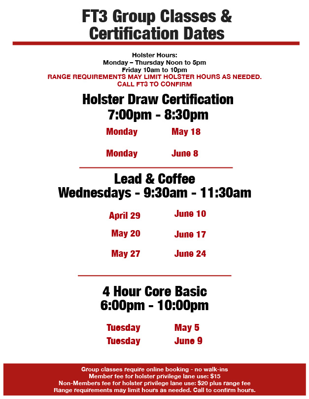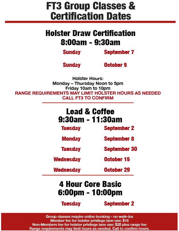 RANGE REQUIREMENTS MAY LIMIT HOLSTER HOURS AS NEEDED. CALL FT3 TO CONFIRM